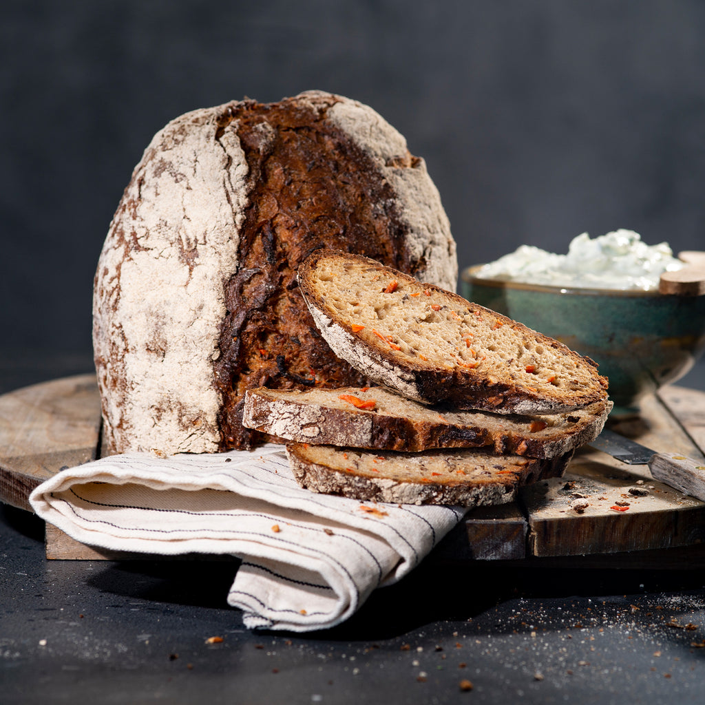 Saftiges Roggenmischbrot mit Karotten, Leinsamen und krosser Kruste.
