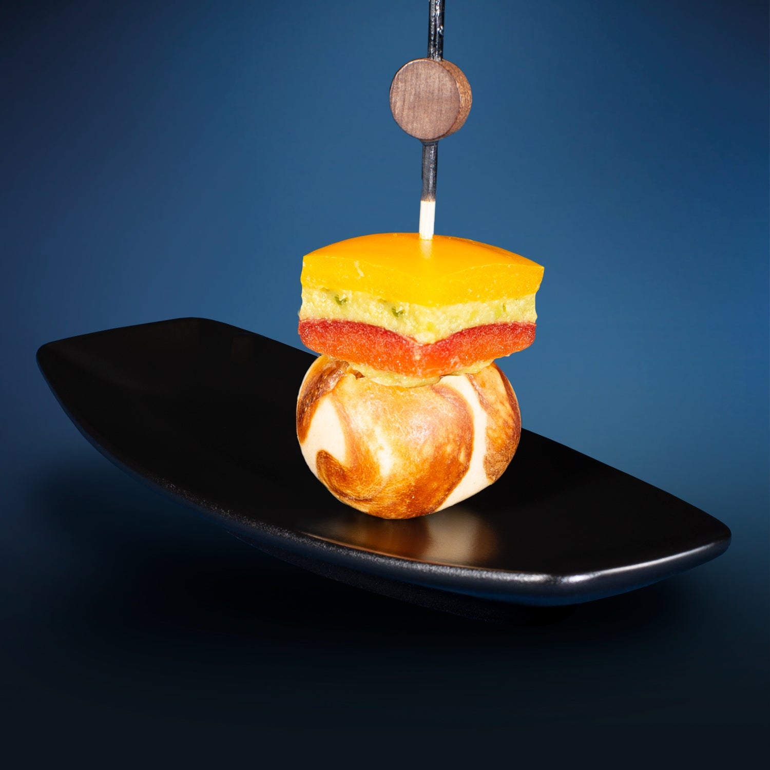 Laugensnack mit Erbsencreme, Paprika rot & gelb – vegan & herzhaft.