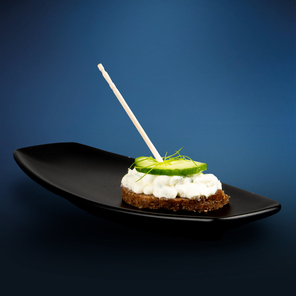 Frische Minigurke und Frühlingsrahm auf rundem Pumpernickel.