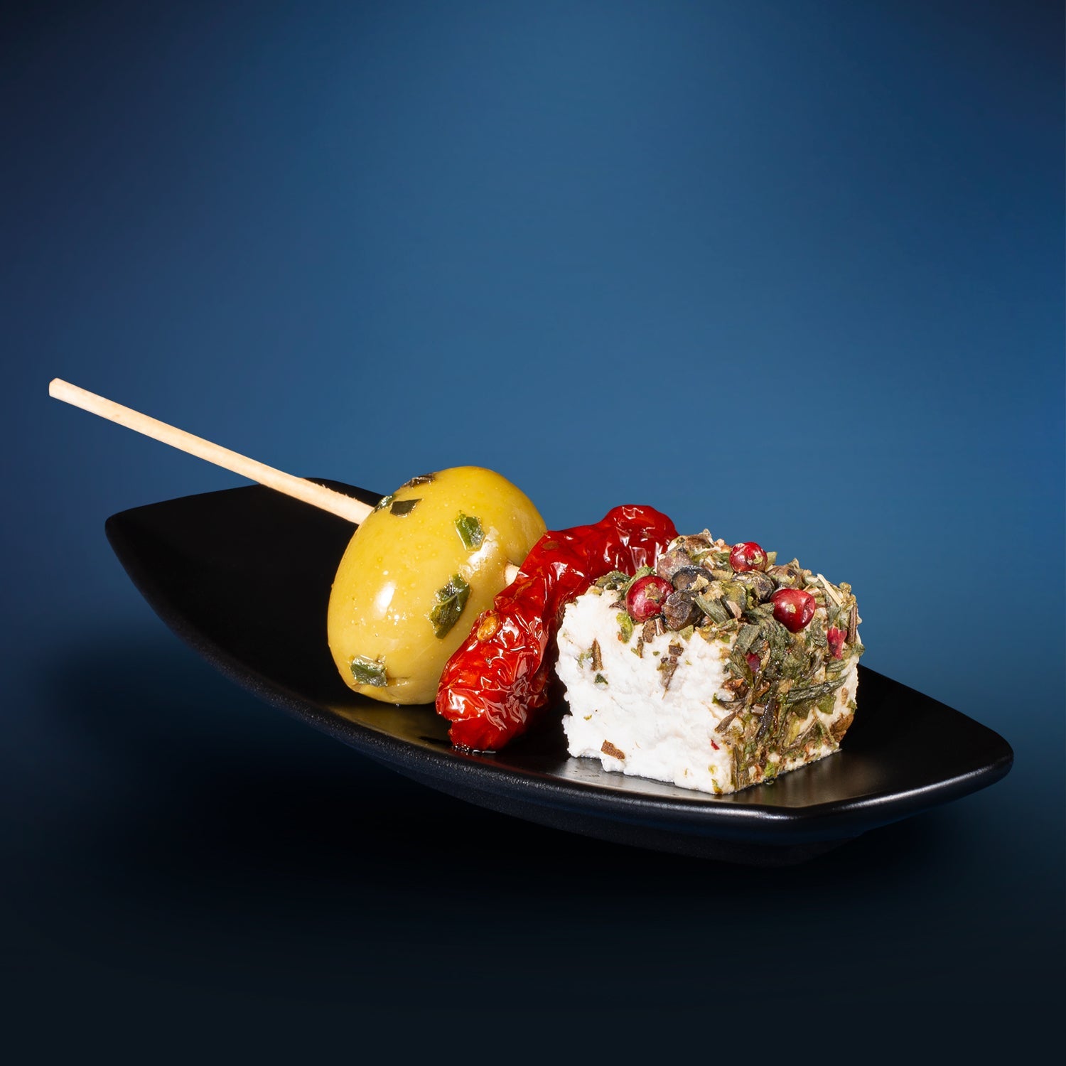 - Aufgespießt mit grüner Olive & sonnengetrockneter Tomate