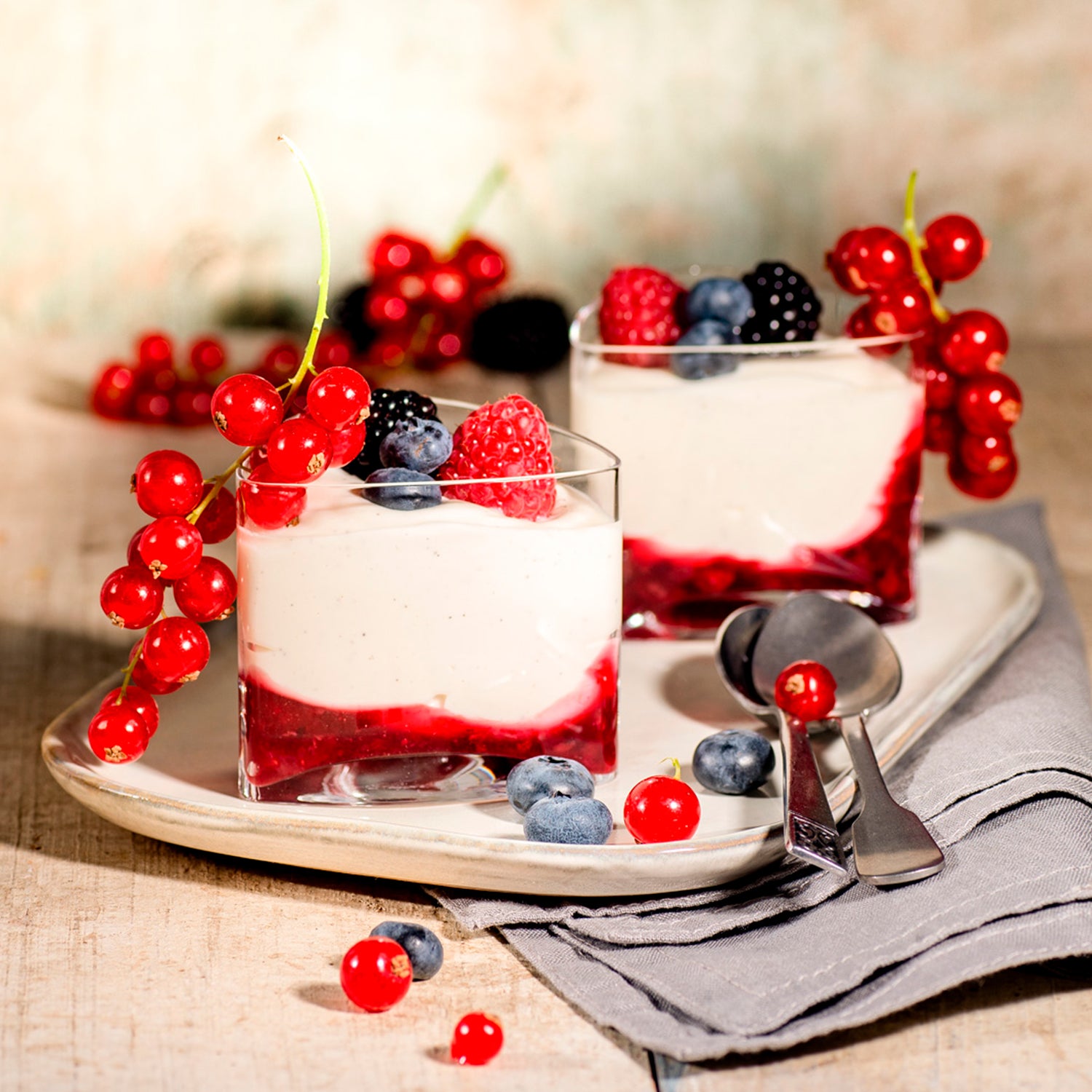 Cremiger Vanillequark mit Roter Grütze – sahnig und fruchtig.
