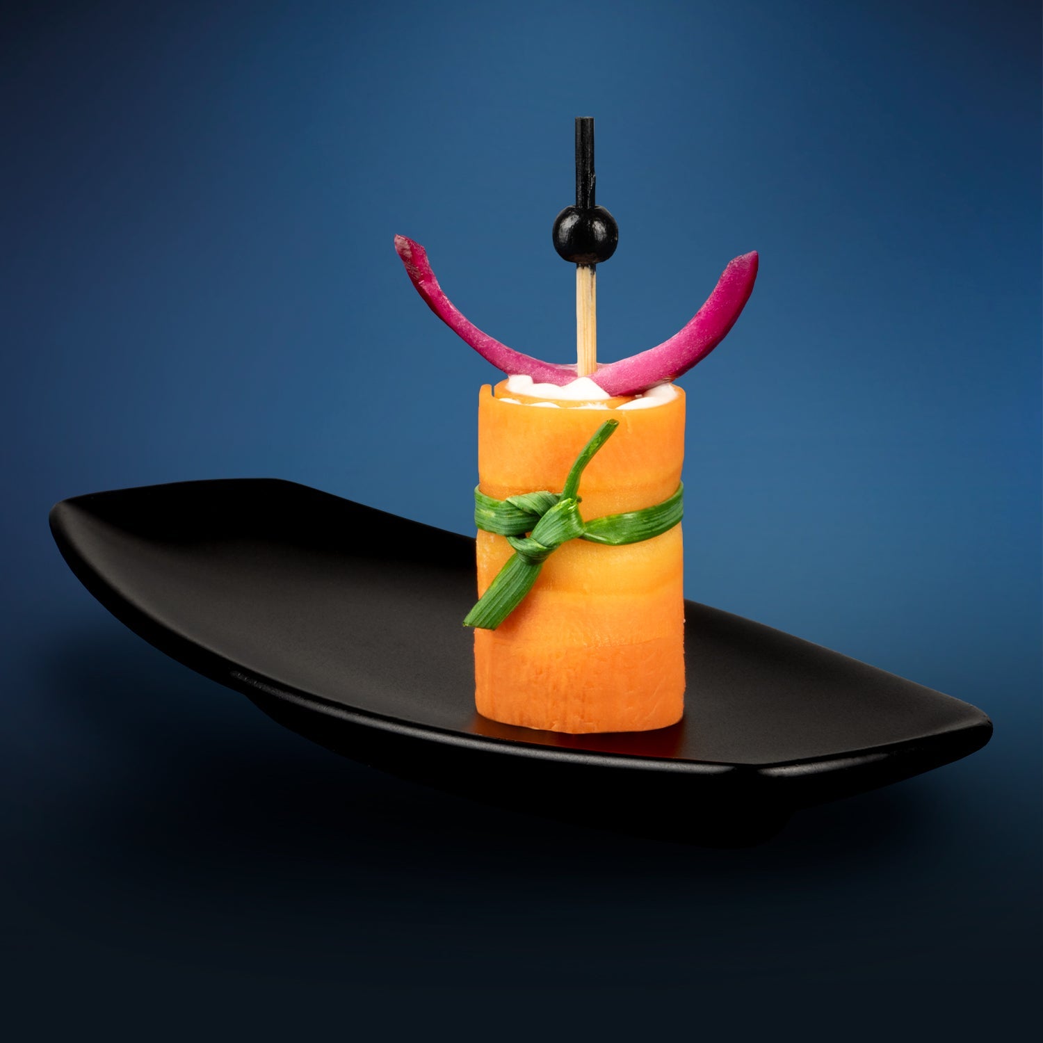 Als Topping sorgt ein mariniertes, rotes Zwiebelblättchen für pikante Frische und rundet das Aroma perfekt ab. Mit Schnittlauch als grünem Akzent überzeugt das Häppchen optisch wie geschmacklich – auf einem eleganten Holzspieß präsentiert.