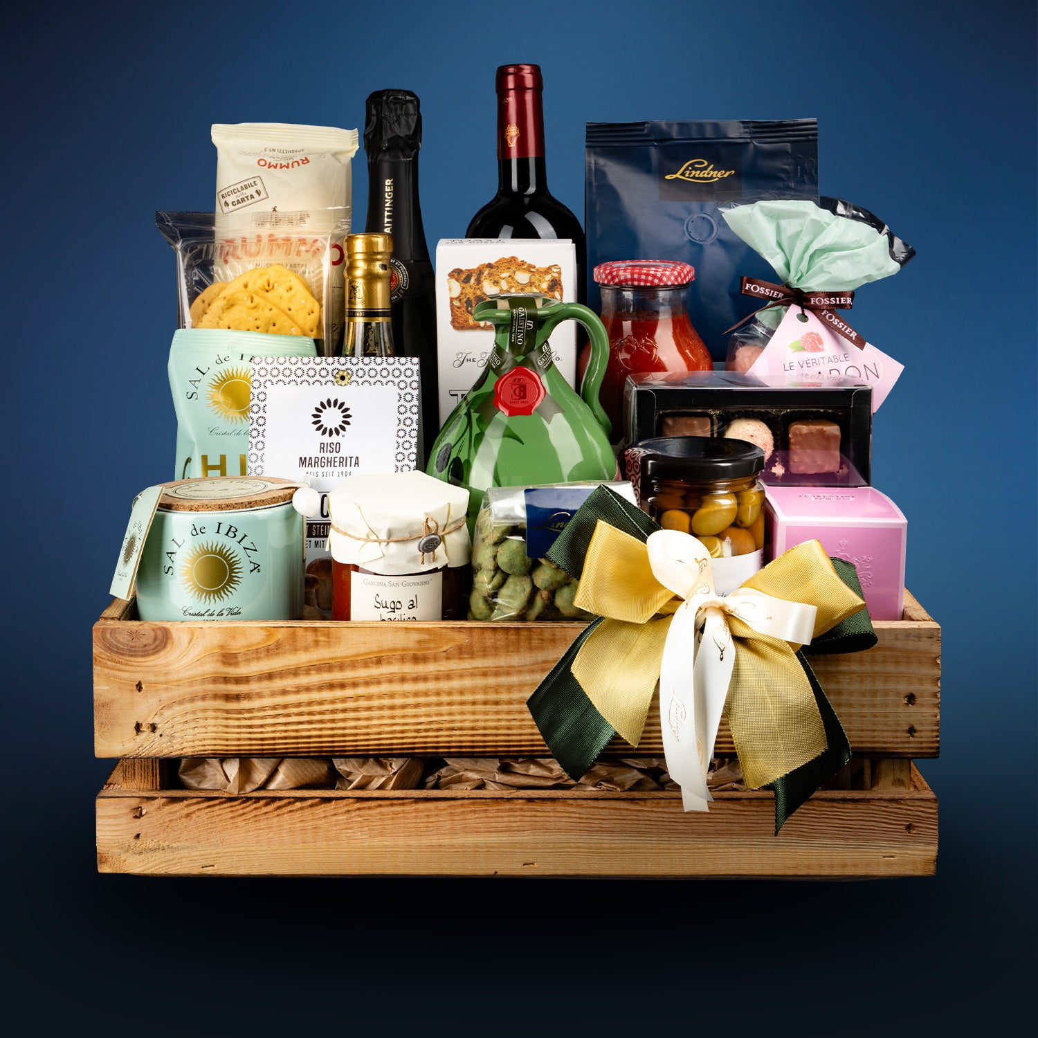 Ein stilvoll arrangiertes Feinkost-Erlebnis in edler Holzkiste als Präsent.