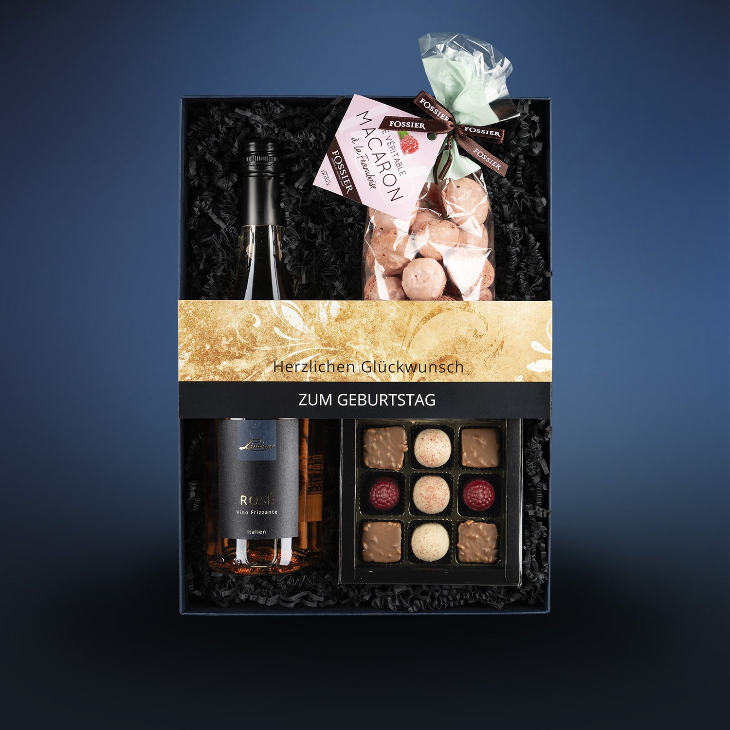 Elegantes Geschenkset mit Rosé-Prosecco, Pralinen & Macarons m blauen Schmuckkarton.
